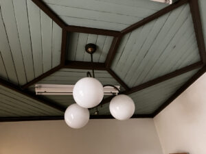理事長室です。天井が特徴的な板の貼り合わせになっていて、照明もおもしろいですね。