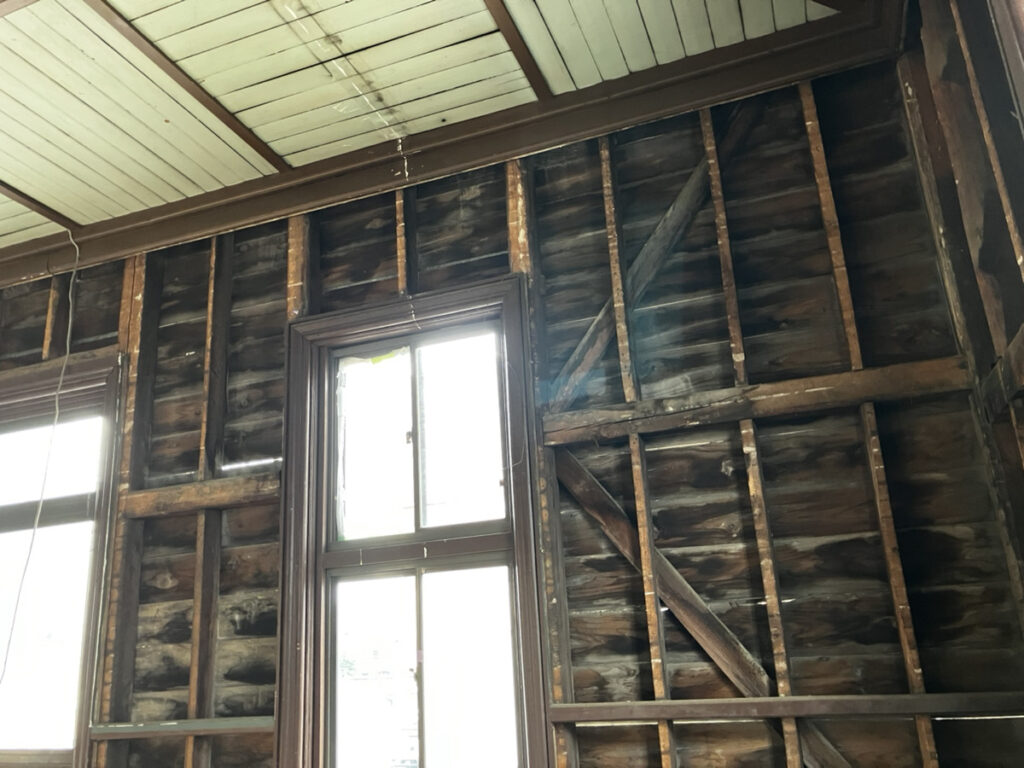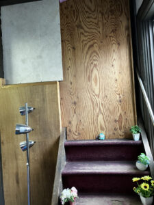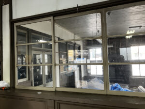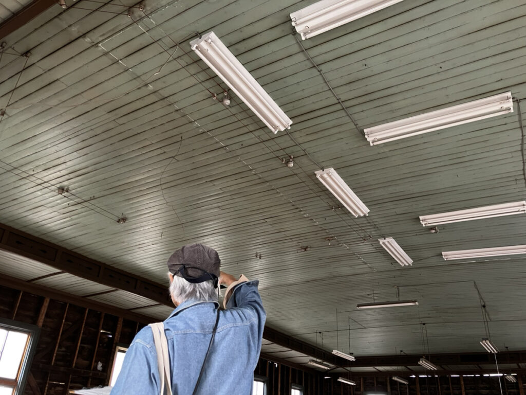 2Fの壁はは筋交いが入っているのですが、1Fは筋交いのない、抜き構造だそうです。地震の際に揺れを逃がすのは抜き構造、対して筋交いは揺れにより強い圧がかかったりすると、それが蓄積して急に壊れることがあるとのこと。協同組合は解散し、不動産会社が20年壊さない約束で買い取り、活用しようとしましたが、その後コロナになり手つかずになってしまいました。現在、その存続に関しては予断を許さない状況になっています。