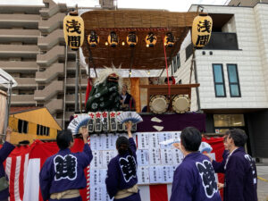 こちらは浅間囃子連の居囃子です。笛と太鼓の音に合わせて、獅子舞が舞い踊ります。おや、まちなかを元気にする会のちびっこリーダーも頑張って太鼓をたたいていますよ。